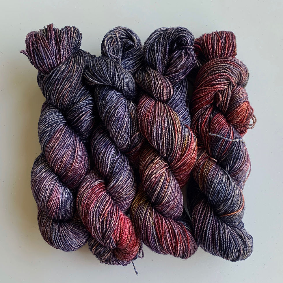 I love doing custom orders! Whether it's dyeing a colorway on the yarn base you choose, or dyeing something new given a mood or a color family you suggest, please feel free to get in touch if there's something you'd like me to try! Note: Items available for sale on this page are reserved for the customer who ordered them, but I can try to recreate them if you're interested.